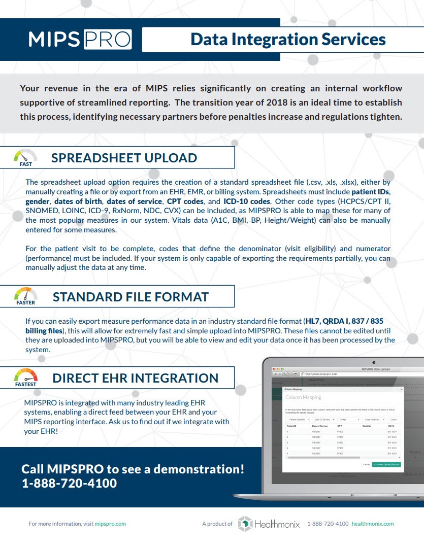 • MIPSPRO integrates data from multiple sources, an ideal feature for health systems that use multiple EHRs.  We combine data to reveal areas for improvement, and to help you report the best measures for your organization.